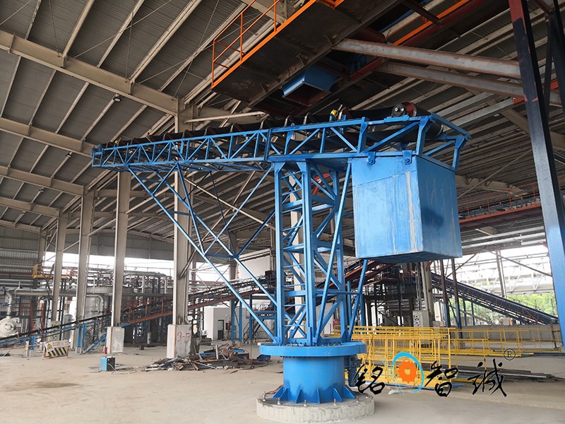 旋轉(zhuǎn)式皮帶輸送機,為散碎物料倉貯輸送設(shè)備,是在安裝有行走輪的支架上部的底盤上安裝一轉(zhuǎn)盤,轉(zhuǎn)盤可相對底盤作旋轉(zhuǎn)運動,皮帶輸送機的進(jìn)料端座在轉(zhuǎn)盤頂部的托盤上,出料端為懸臂式,配重箱在托盤上用以上與懸臂配重,倉貯時,物料通過料斗由輸送帶送至遠(yuǎn)端,推動懸臂即可改變堆積位置,在庫房內(nèi)實現(xiàn)多點堆積而勿需停機和移動機體,連續(xù)作業(yè)省時省力,操作方便,尤其適用于糧食的倉貯輸送。